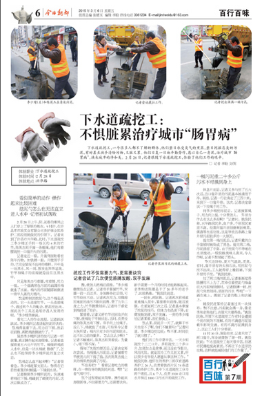 11時(shí)30分,體驗(yàn)結(jié)束,記者只挖了兩口窨井,渾身就像散了架一樣。姚俊民說:“下水道疏挖工每天很辛苦,但愿市民都能提高素質(zhì),不再往下水道里扔垃圾,這樣就能減輕他們的工作量了!