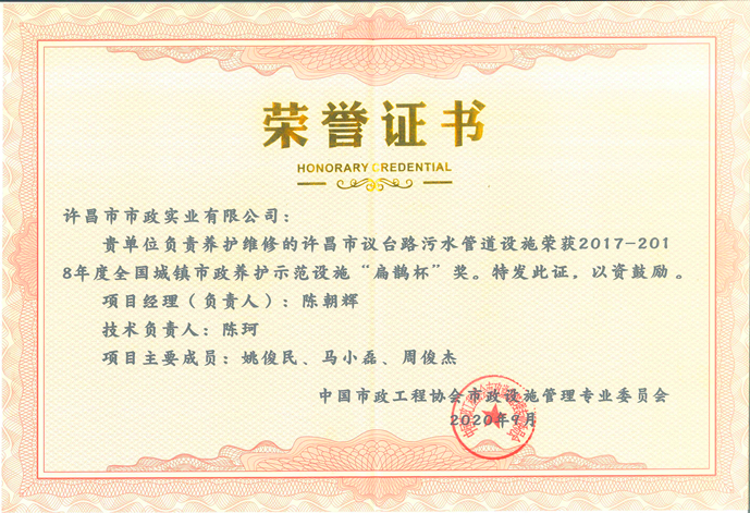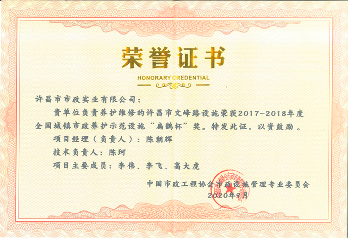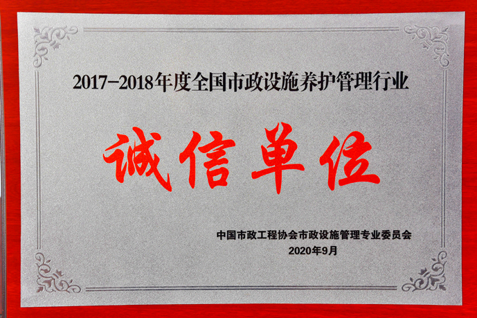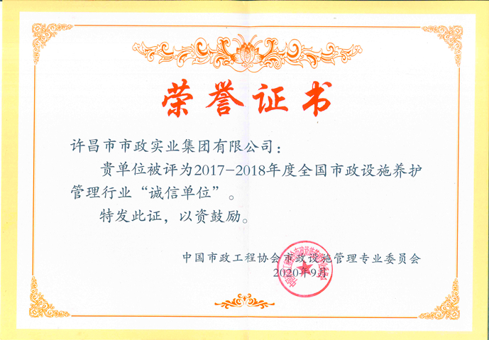 此外,許昌市政集團(tuán)還被評(píng)為2017-2018年度“全國(guó)市政設(shè)施養(yǎng)護(hù)管理行業(yè)誠(chéng)信單位”。